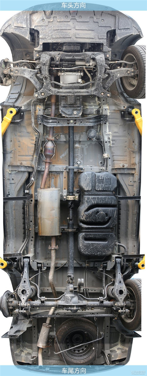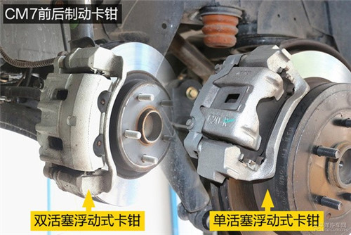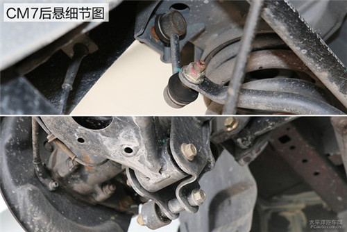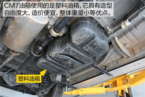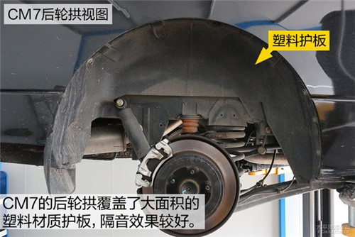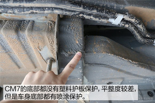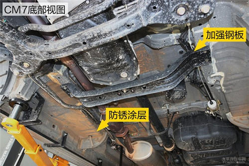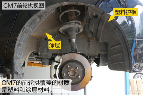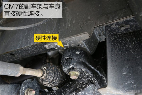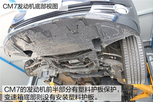 CM7的底盘整体布置中规中矩,前悬采用L臂麦弗逊式独立悬架,后悬采用的是五连杆螺旋弹簧的整体桥式非独立悬架。车辆前端底部有塑料护板防护,发动机下、车身底部都是没有护板保护,但是裸露的部分都是有涂层保护。