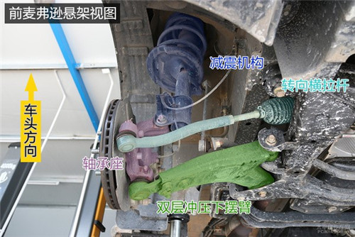下摆臂与副车架的连接处采用了橡胶圈连接,但副车架与车身的连接则没有使用橡胶垫。下摆臂和转向拉杆与轴承座之间的连接则采用带防尘套的鱼眼螺栓。