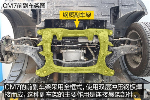 CM7的前副车架采用双层冲压钢板焊接,虽然是全框式副车架,但副车架并没有延伸到车辆前端,因此它的主要作用是连接悬架杆件。